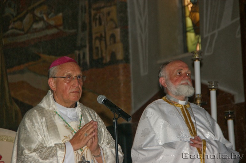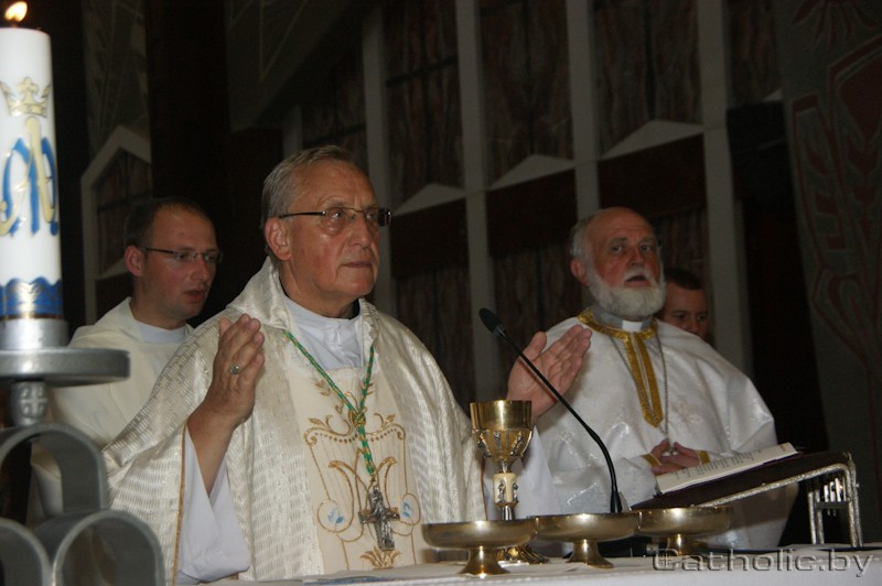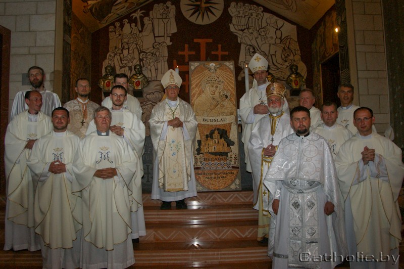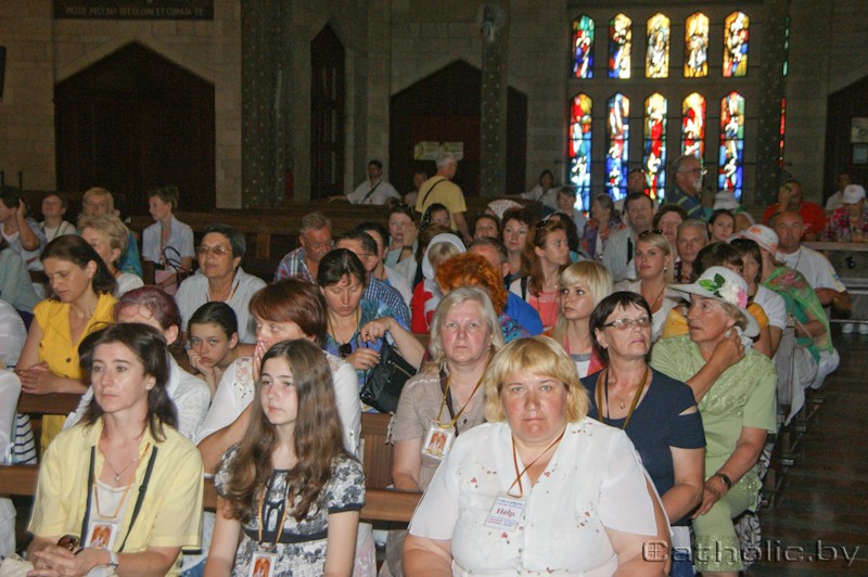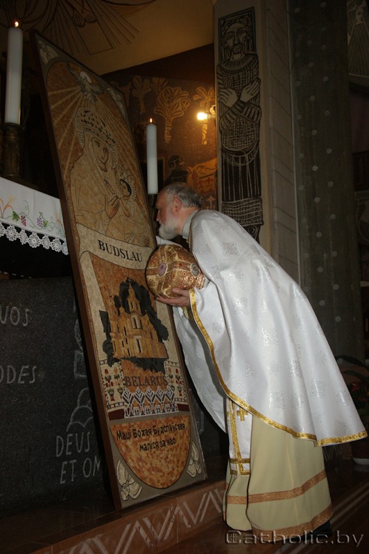Урачыстасці распачаліся святой Імшой у Базыліцы Звеставання Найсвяцейшай Панны Марыі, у якіх прынялі ўдзел усе 300 пілігрымаў. Перад Імшой мазаіка была ўнесена ў Базыліку і змешчана ў бакавым алтары. Святую Імшу ўзначаліў Мітрапаліт Мінска-Магілёўскi арцыбіскуп Тадэвуш Кандрусевіч. Разам з ім Эўхарыстыю цэлебравалі дапаможны біскуп Гродзенскай дыяцэзіі Юзаф Станеўскі, Апостальскі візітатар для грэка-католікаў Беларусі архімандрыт Сяргей Гаек і святары з Беларусі. У гаміліі арцыбіскуп адзначыў: «Божы Провід прывёў нас, беларускіх пілігрымаў, у Назарэт, у месца, дзе 2000 гадоў таму здзейснілася таямніца Звеставання Пана. Са Старога Запавету мы ведаем, што людзі пагардліва ставіліся да Назарэта. Яны нават казалі: “Што добрага можа быць з Назарэта?” Аднак гісторыя паказала, што апошні можа стаць першым. Менавіта ў малым і забытым усімі Назарэце Бог праз арханёла Габрыэля аб’явіў Марыі сваю волю. Марыя яе прыняла, і пад Яе сэрцам пачало біцца сэрца будучага Збаўцы свету». Таксама іерарх дадаў: «Мы ўшаноўваем месцы, дзе нарадзіліся, жылі, вучыліся ці працавалі вядомыя людзі. Сёння Божы Провід прывёў нас у месца, дзе, дзякуючы згодзе Марыі з Божай воляй, распачалася новая эра — эра збаўлення». Напрыканцы Імшы была асвячана мазаічная выява Будслаўскага абраза, каля якога быў прачытаны Акт прысвячэння Беларусі Беззаганнаму Сэрцу Найсвяцейшай Панны Марыі. Пазней мазаіка будзе ўсталявана ў падворку Назарэтанскай Базылікі з левага боку ад цэнтральнага ўваходу. Кіраўнік турыстычнай фірмы, якая арганізавала пілігрымку і выкананне мазаікі цудоўнага абраза Маці Божай Будслаўскай, спадар Джордж выказаў сваю радасць з нагоды асвячэння, а таксама выказаў надзею, што пакаленні беларусаў будуць прыбываць сюды, каб маліцца ў гэтым святым месцы. Месца ж будзе прадстаўляць Будслаўская Мадонна. Арцыбіскуп Тадэвуш Кандрусевіч падзякаваў усім прысутным, пры гэтым ён падкрэсліў, што «з сённяшняга дня ў святым горадзе Назарэце знаходзіцца беларускі знак, які будзе абвяшчаць аб нашай краіне і Каталіцкім Касцёле ў ёй». Гэта ўжо другі такі знак на Святой Зямлі. Першы быў усталяваны ў 2011 годзе ў касцёле «Ойча наш» у Ерузалеме. Пасля цырымоніі асвячэння прысутныя праспявалі гімн «Магутны Божа». Пазней пілігрымы наведалі дом святога Юзафа, дзе жыла Святая Сям’я, калодзеж Марыі, куды яна хадзіла па ваду і нацыянальны парк Ізраэля — Сепфорыс, які знаходзіцца за 6 км ад Назарэту. Далей пілігрымы накіраваліся ў Кану Галілейскую, дзе Езус здзейсніў першы цуд — перамяніў ваду ў віно на вяселлі і гэтым самым вызваліў маладых са складанай сітуацыі, калі не хапала віна. Трыдыцыйна ў гэтым месцы сужэнскія пары аднаўляюць свае абяцанні. Так было і на гэты раз. У сваім слове Мітрапаліт прыгадаў аб сям’і, як Богам створаным інстытуце з мэтай сумеснага жыцця, працягвання чалавечага патомства і яго выхавання. Іерарх таксама прыгадаў аб сучасных сямейных крызісах і заклікаў прысутных маліцца за сем’і, каб яны былі хатнімі Касцёламі, месцам прыйсця на свет Божага дару жыцця і яго хрысціянскага выхавання, бо сям’я з’яўляецца галоўнай клеткай кожнай супольнасці. Арцыбіскуп Тадэвуш Кандрусевіч таксама, перафразуючы словы св. Яна Паўла ІІ, сказаў: «Беларусь, калі хочаш быць вялікай, беражы жыццё». Паводле Catholic.by |