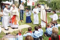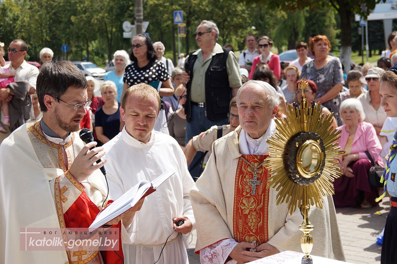 У працэсіі ўдзельнічалі таксама вернікі грэка-каталіцкай парафіі разам са сваім душпастырам а. Васілём. - Мы выйдзем на вуліцу з Целам Ісуса Хрыста, каб Ён асвяціў гэты горад, вёў яго да большай духоўнасці. Мы выйдзем у знак падзякі Госпаду за тое, што Ён дае нам Сябе самога, - адзначыў біскуп Казімір Велікаселец, які ўзначальваў працэсію. - Для выратавання абавязкова патрэбна Божая мілата, а самую вялікую ласку мы атрымліваем тады, калі прыходзім у храм на споведзь, на службу і прымаем Камунію - Божае Цела. - Гасподзь ператварае хлеб і віно ў Свае Цела і Кроў, каб карміць нашу душу. І Хрыстос можа вылечыць не толькі душу, але і фізічнае цела. Працэсія з прыкладна трохсот вернікаў прайшла па цэнтральнай вуліцы Савецкай ад касцёла да Дома міласэрнасці сясцёр Маці Тэрэзы. Па шляху дзяўчынкі усыпалі пялёсткамі кветак дарогу для Езуса, прысутнага ў Найсвяцейшым Сакрамэнце. На прыпынках каля алтароў працэсія слухала чытанні з Евангелля і малілася за Гомель, Беларусь, увесь свет. Правёўшы працэсію, біскуп таксама памаліўся аб тым, каб у Гомелі панавалі мір і любоў, каб людзі паважалі адзін аднаго, каб Гасподзь дабраславіў сямейнае жыццё і працу парафіянаў, вучобу моладзі. Таксама біскуп падзякаваў удзельнікам, работнікаў міліцыі і «хуткай дапамогі», якія суправаджалі працэсію, пажадаўшы ўсім Божага благаслаўлення. Паводле Гомельскага каталіцкага партала |