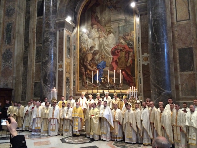 12 лістапада 2015 г., у свята святамучаніка Язафата, дэлегацыя Беларускай Грэка-Каталіцкая Царквы прыняла ўдзел ва ўрачыстай Літургіі ў базыліцы св. Пятра ў Ватыкане. Боскую Літургію пры алтары, дзе захоўваюцца мошчы святога, узначаліў архібіскуп Кірыл (Васіль), сакратар Кангрэгацыі Усходніх Цэркваў. З ім саслужылі іерархі Славацкай Грэка-Каталіцкай Царквы (мітрапаліт Прэшаўскі Ян, біскук Кошыцкі Мілан і біскуп Братыслаўскі Пётр), біскуп украінскай епархіі ў Лондане Глеб і дапаможны біскуп Тарнопальскай архіепархіі Теадор, а таксама прадстаўнікі беларускага грэка-каталіцкага духавенства архімандыт Сяргей (Гаек) і іераманах Лявонцій (Тумоўскі). Акрамя таго, Літургію саслужылі шматлікія святары з Украіны, Славакіі, Расіі, Харватыі, Бразіліі, Вялікабрытаніі, Італіі (некаторыя лацінскага абраду). “На гэтым месцы, ля мошчаў святамучаніка Язафата – Архібіскупа Полацкага, хачу сёння сардэчна прывітаць вернікаў з Беларусі, якія моляцца разам з намі. Пяцьдзясят год таму, у час Другога Ватыканскага Сабору, рашэннем святога Папы Яна Паўла XXIII, тут – у Базіліцы святога Пятра – былі складзеныя мошчы святога Язафата, які на беларускай зямлі - у Віцебску – прыняў вянец мучаніцтва. У той дзень пераносу сюды святых мошчаў – побач мітрапаліта Ёзыфа Сліпога ды іншых украінскіх Уладык маліўся і беларускі грэка-каталіцкі біскуп Чэслаў Сіповіч, якога сто гадоў нараджэння адзначалася ў мінулым годзе. На рукі прысутнага тут архімандрыта Сяргея (Гаека), Апостальскага Візітатара для грэка-католікаў Беларусі, жадаю перадаць дар братэрскай малітвы ды словы нашай духовай салідарнасці для ўсіх вернікаў Беларускай Грэка-Каталіцкай Царквы ў Беларусі і ў замежжы. Няхай у Юбілейным Годзе Міласэрнасці, праз малітвы святамучаніка Язафата, Госпад шчодра адорыць вас усіх шматлікімі ласкамі, няхай дае вам дар мужна ды плённа вяшчаць Евангелле радасці і міласэрнасці”. *** Святы Язафат, архібіскуп Полацкі, біскуп Віцебскі і Мсціслаўскі, загінуў мучаніцкай смерцю ў Віцебску ў 1623 г. Яго мошчы, знойдзеныя ў 1916 г. у Белай Падляскай, былі перавезены ў Вену, а потым – у Ватыкан. У 1964 г. яны былі перанесяныя ў базыліку св. Пятра, дзе і захоўваюцца ды ўшаноўваюцца зараз. Паводле беларускай рэдакцыі Ватыканскага радыё Фота беларускай рэдакцыі Ватыканскага радыё і Д. Лісейчыкава |