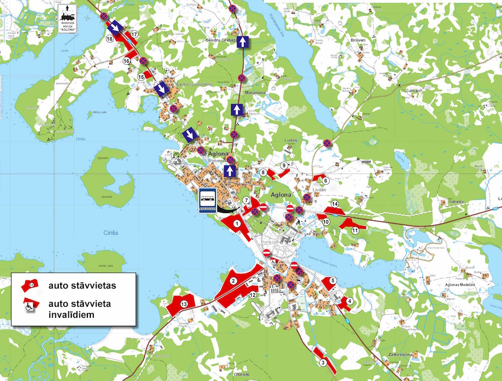 2. С 22 по 25 сентября на территории Аглоны будет оборудовано 18 автостоянок для легковых автомобилей и автобусов паломников. Большинство из них – неподалеку от базилики. Они будут находиться рядом с дорогами, ведущими в Аглону с разных сторон. Для людей с ограниченными возможностями стоянку планируется расположить ближе всего к базилике – на улице Краславас. В эти дни во многих местах будут запрещены остановка и стоянка автомобилей. Это в первую очередь дороги возле базилики. Кроме того, будет запрещено останавливаться и стоять на участке пути от Аглонского железнодорожного вокзала до поселка Аглона и на дороге в направлении Яунаглоны (см. схему № 4 по организации дорожного движения). Водители грузовиков должны учитывать, что намечены ограничения на транзитные перевозки. В эти дни рекомендуется пользоваться объездными дорогами (см. cхему).
