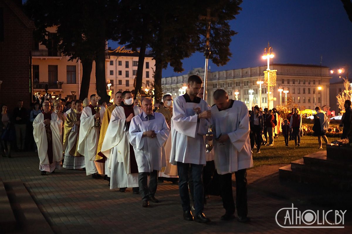 Увечары 5 верасня ў мінскім касцёле святога Сымона і святой Алены вялікая колькасць людзей узяла ўдзел у святой Імшы за пацярпелых, забітых і зняволеных на мірных акцыях пратэсту ў Беларусі. Цэлебрацыю ўзначаліў Генеральны вікарый Мінска-Магілёўскай архідыяцэзіі біскуп Юрый Касабуцкі. Да іх духоўна далучыліся яшчэ каля трох тысяч, якія глядзелі анлайн-трансляцыю набажэнства на партале Catholic.by. У час, калі арцыбіскуп Тадэвуш Кандрусевіч знаходзіцца ў выгнанні і не мае пагчымасці вярнуцца на Радзіму, Генеральны вікарый ажыццяўляе пастырскае кіраўніцтва Мінска-Магілёўскай архідыяцэзіяй. На пачатку Імшы біскуп Касабуцкі прывітаў усіх сабраных у Чырвоным касцёле. Сярод іх былі не толькі прадстаўнікі розных хрысціянскіх канфесій, але таксама юдэйскай супольнасці і нават няверуючыя, якія з патрэбы сэрца прыйшлі ў гэты вечар у святыню. Іерарх заклікаў усіх да супольнай малітвы, якую параўнаў з бальзамам, здольным загаіць зраненыя болем душы. Пасля гэтага біскуп з кароткім словам прывітання на англійскай мове звярнуўся да супрацоўнікаў дыпламатычных місій, якія прыйшлі, каб памаліцца разам з беларусамі і такім чынам выказаць сваю салідарнасць з народам нашай краіны у час нечуванага гуманітарнага крызісу. У прамоўленай гаміліі Генеральны вікарый Мінска-Магілёўскай архідыяцэзіі напачатку нагадаў, якія жудасці давялося перажыць многім удзельнікам мірных акцый пратэсту ў розных населеных пунктах Беларусі, і што некаторыя з іх ужо ніколі не вернуцца дадому. «Даруй нам, Божа, за тое, што на нашай зямлі хтосьці загінуў, бо гэта трагедыя; трагедыя ўсяго нашага народа!» — сказаў іерарх. Ён дадаў, што людзі загінулі толькі за тое, што хацелі праўды і справядлівасці. «Я думаю, што гэтых людзей, нават калі яны былі няверуючымі, нават калі яны былі далёка ад Бога, Бог прытуліў да свайго Сэрца», — адзначыў біскуп Юрый. Ён расказаў пра тое, якімі жахлівымі сведчаннямі з ім як святаром дзяліліся людзі, што перажылі здзекі і катаванні на Акрэсціна і ў іншых месцах зняволення, куды іх забралі толькі за тое, што яны выступілі супраць няпраўды. Пры гэтым біскуп падкрэсліў, што фізічныя раны, нават цяжкія, загояцца, але найбольш страшнымі з’яўляюцца наступствы псіхалагічнай траўмы. Яна раніць не толькі душу чалавека, які перанёс гвалт, але таксама душы яго бацькоў, родных, і проста неабыякавых людзей, сеючы ў іх насенне крыўды і нянавісці, няздольнасці прабачыць. «Менавіта гэта д’ябал хацеў пасеяць у сэрцах нашых людзей. Мы, беларусы, заўсёды былі мірнымі людзьмі, міралюбнымі; мы заўсёды жылі ў згодзе, але ў нас сеюць гэтую нянавісць, сеюць гэтую злосць у нашыя сэрцы. І мы асабліва молімся за ўсіх людзей, якія пацярпелі ад насілля: за тых студэнтаў, якіх сёння так брутальна, жудасна на Карла Маркса хапалі, скручвалі; за тую дзяўчыну, якую цягнулі за валасы. Молімся асабліва за ўсіх гэтых людзей, бо кожны з іх атрымлівае псіхалагічную траўму, з якой трэба будзе жыць доўга», — сказаў біскуп Юрый Касабуцкі. Пастыр растлумачыў сэнс хрысціянскага прабачэння, да якога заклікае людзей Бог і пра што згадвае арцыбіскуп Тадэвуш Кандрусевіч у сваім звароце да паствы з выгнання. Біскуп Касабуцкі падкрэсліў, што прабачэнне — гэта не аднаразовы акт, а каласальная праца. Іерарх нагадаў словы святога Яна Паўла ІІ, які казаў, што прабачэнне — гэта не слабасць, а праява