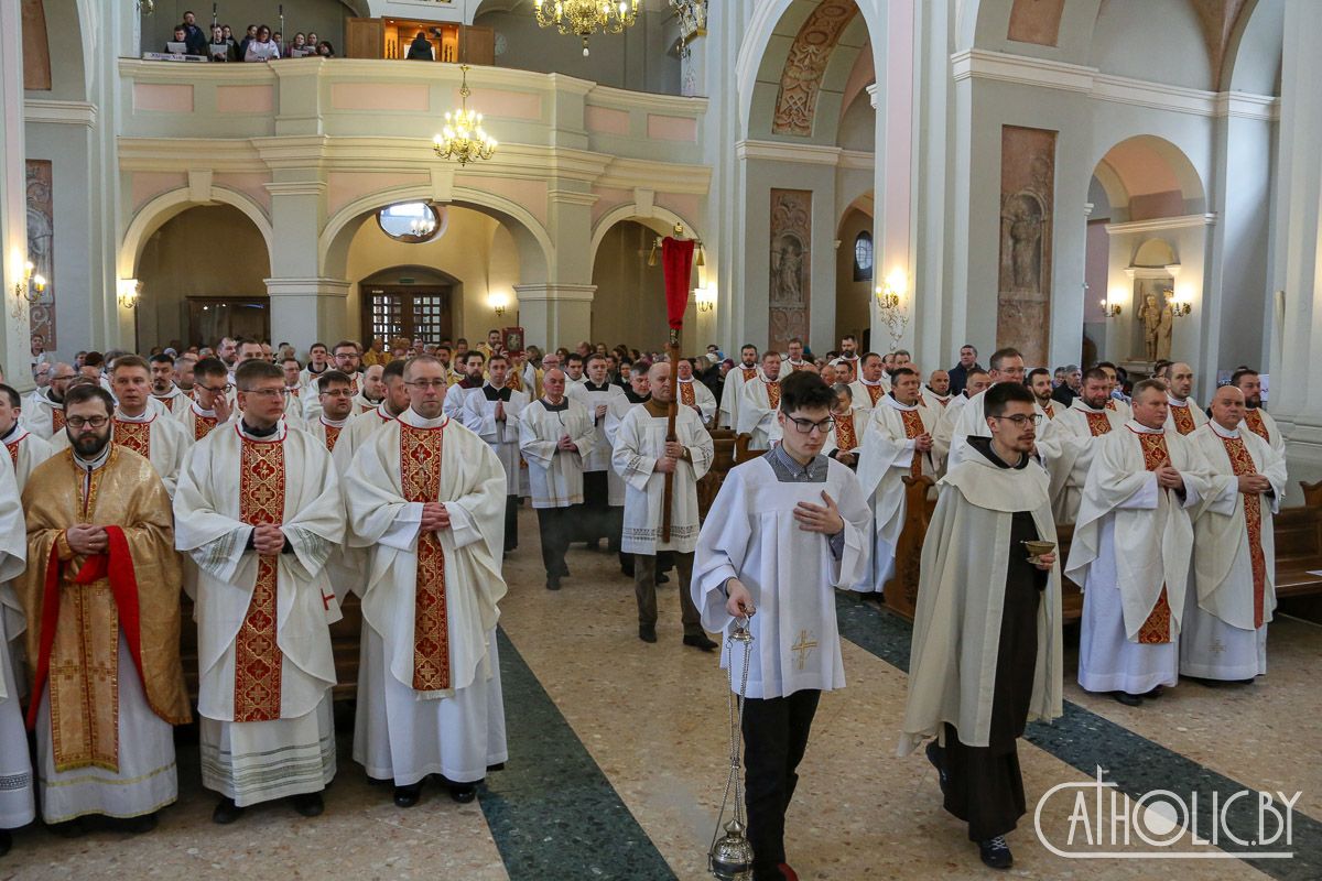 Каля сотні святароў з розных парафій Мінскай вобласці прыбылі ў галоўную святыню архідыяцэзіі, каб на чале са сваім біскупам узяць удзел у гэтай асаблівай цэлебрацыі на працягу літургічнага года, падчас якой успамінаецца ўстанаўленне сакрамэнту святарства. Узначаліў урачыстую цэлебрацыю, у якой узяў удзел таксама прадстаўнік Папы Францішка ў нашай краіне Апостальскі нунцый Антэ Ёзіч, Мітрапаліт Мінска-Магілёўскі арцыбіскуп Юзаф Станеўскі.