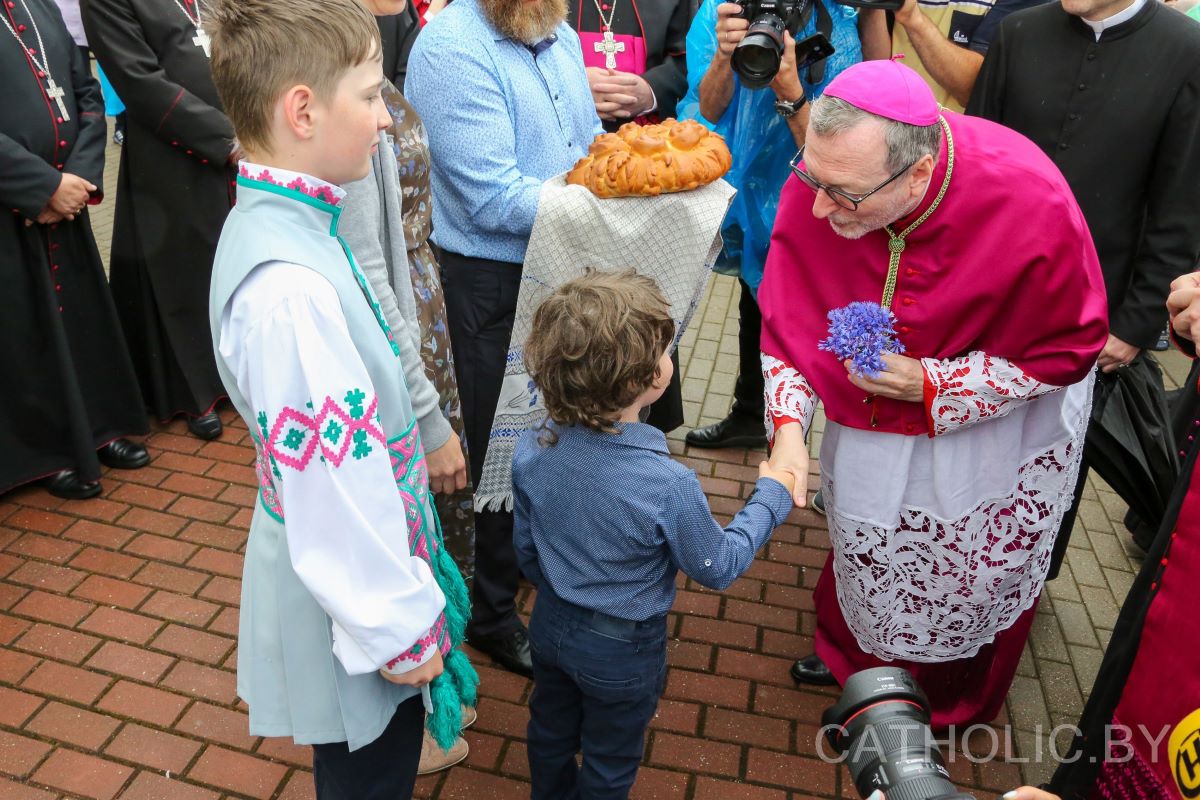 Няхай Яе поўны пяшчоты позірк і мацярынская ўсмешка нагадае Вам сёння Вашу дарагую маму, якая адышла ў вечнасць тады, калі Вы неслі служэнне Апостальскага нунцыя ў Беларусі і часта бывалі ў нашым Нацыянальным санктуарыі, дзе заўсёды знаходзілі суцяшэнне і падтрымку. У Будславе вы не ў гасцях, а ў доме Матулі, якая саграе цяплом свайго Сэрца ўсіх сваіх дзяцей»,— сказала дзяўчынка, а хлопчык папрасіў арцыбіскупа перадаць словы ўдзячнасці і прывітання Папу Францішку. На памяць Спецыяльнаму прадстаўніку Святога Айца быў падараваны спіс абраза Маці Божай Будслаўскай.