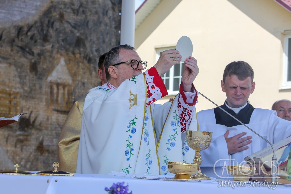 Прыгожая святарская шата белага колеру з вышытай Маці Божай Будслаўскай упершыню выкарыстоўвалася на святой Імшы, цэлебрацыю якой на палявым алтары ўзначаліў арцыбіскуп Гуджэроцці.