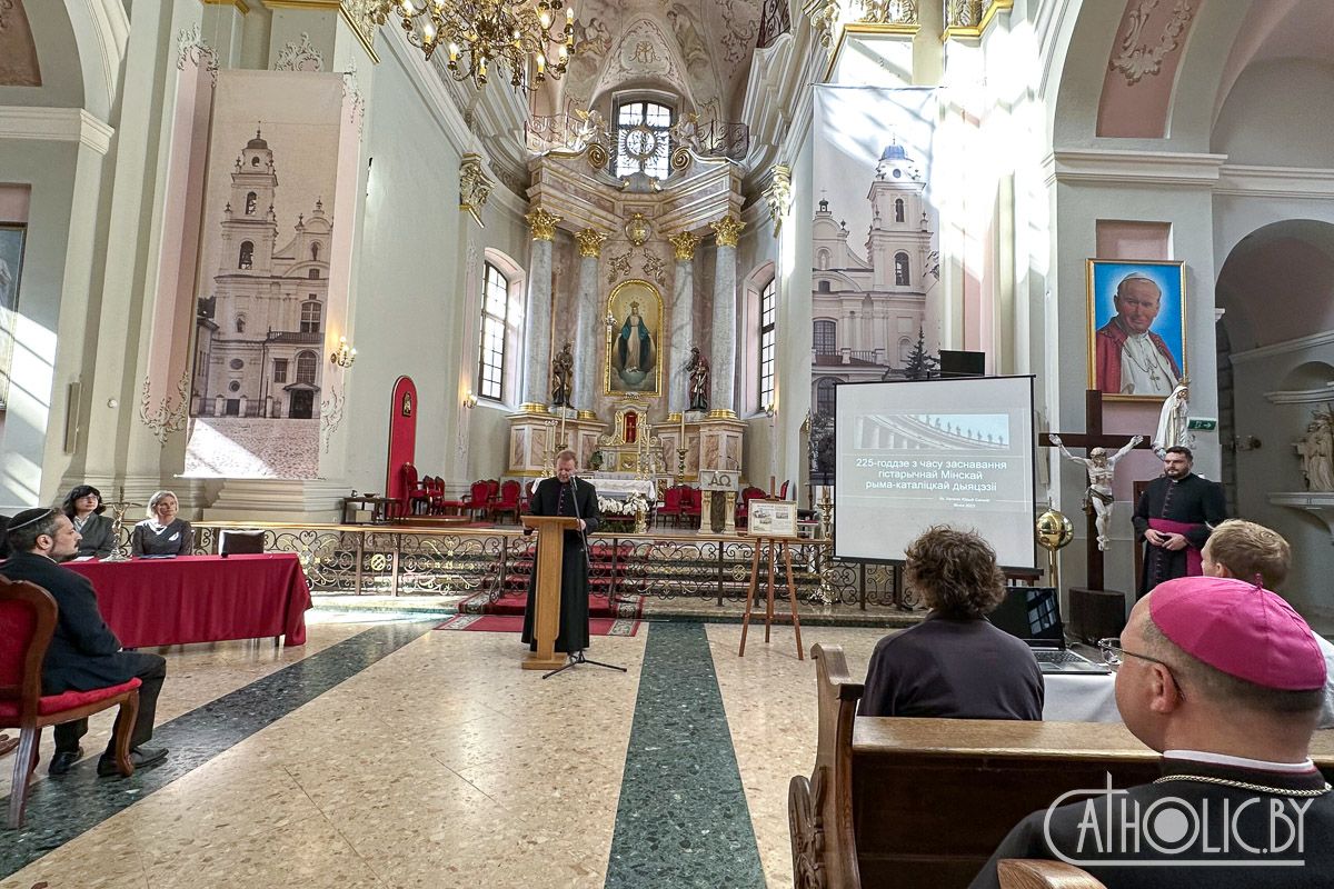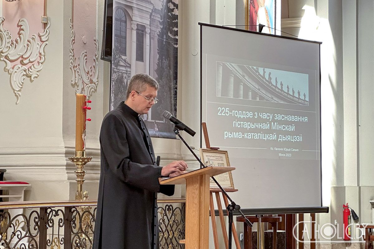 Першы выступовец, ксёндз доктар Юрый Дрозд, зрабіў кароткі экскурс у гісторыю Мінскай дыяцэзіі, аб стварэнні якой у 1798 годзе абвясціў расійскі імператар Павел І.
