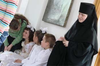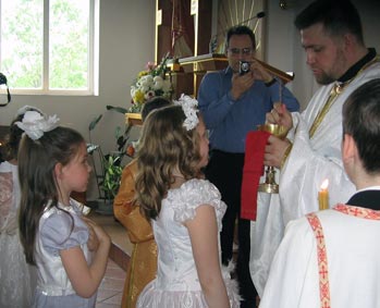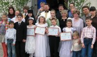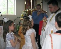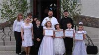 У Нядзелю Ўсіх Сьвятых, 18 траўня, у нашай парафіі чацьвёра дзяцей: АНАСТАСІЯ АБЛАМЕЙКА, ВАЛЕРЫЯ ЖУКОЎСКАЯ, АЎГУСТА СІЗОНАВА і АЛЕГ МАЗУРКЕВІЧ першы раз у сваім жыцьці прыступіліся да Таямніцы Споведзі і ўрачыста прынялі Сьвятое Прычасьце.