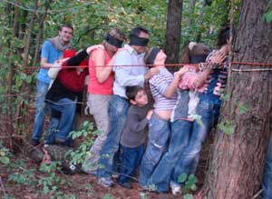 Уявіце сабе - сетка з 12-ці даволі вялікіх на першы погляд вочак, праз якія (ні разу не паўтарыўшыся вочкам) трэба прапусьціць усіх удзельнікаў каманды. І - ніводнага слова!!! А вочкі, паміж іншым, тры шэрагі па чатырох, і ніжні шэраг амаль у метры ад зямлі. І - круціцеся, як жадаеце, а: бязгучна - гэта раз, і - не дакранаючыся сеткі - гэта два! А інструктар, хітрая шэльма, толькі пляскае ў ладкі: "Вяртаемся назад" - парушэнне правіл.